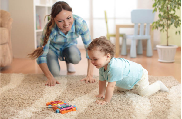 - Bước 1: Ba mẹ ngồi hoặc quỳ xuống để dễ dàng hỗ trợ việc giữ thăng bằng cho trẻ.